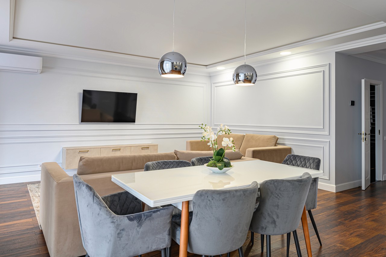 An elegant open-plan living and dining space featuring custom wainscoting, warm neutral tones, and refined finishes that flow seamlessly into the kitchen.