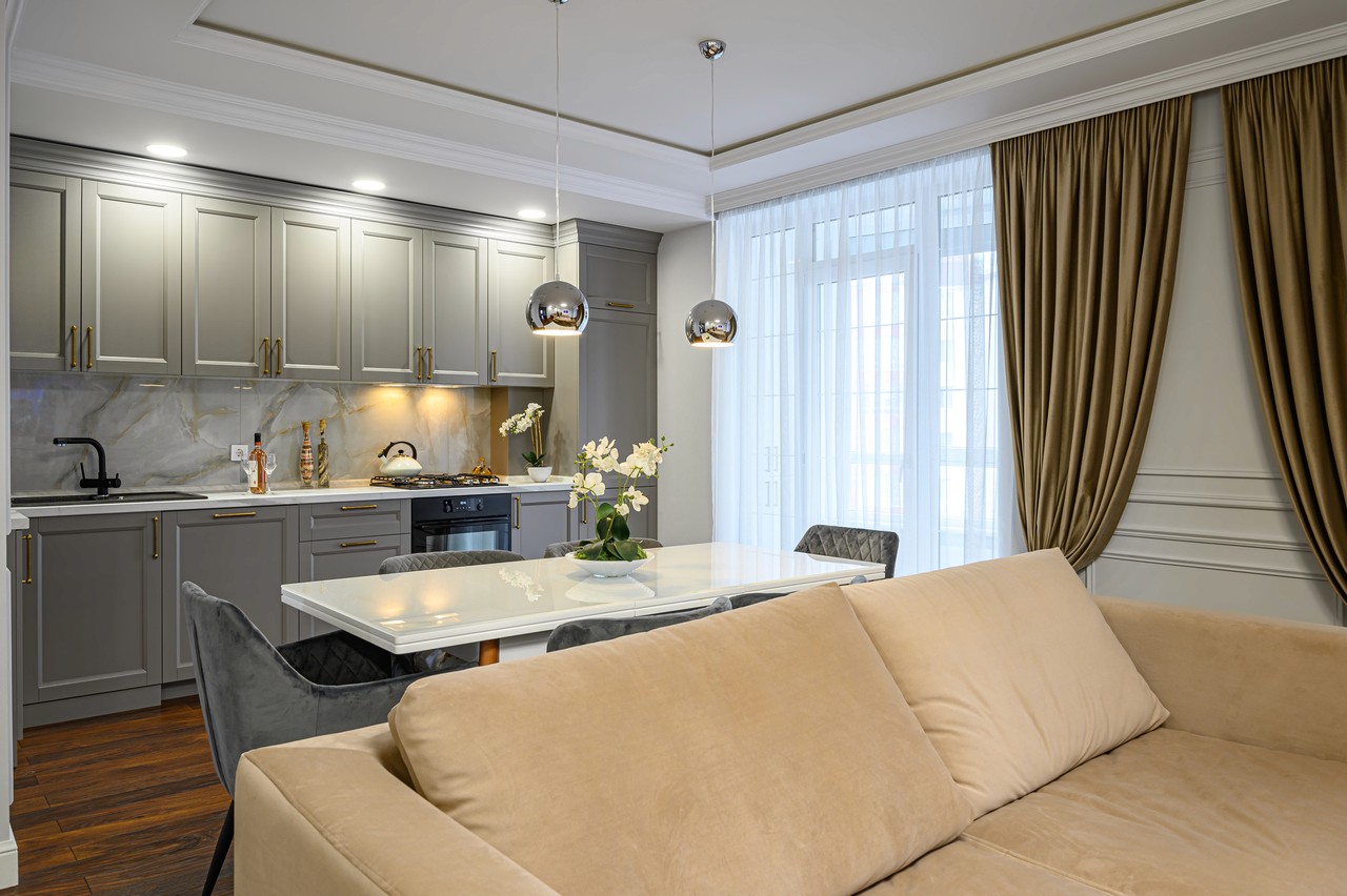 The living area features a plush sectional in warm camel, anchored by a textured area rug that softens the space. A floating media console keeps the TV wall clean and modern. Chrome globe pendants over the dining table echo the fixtures in the adjacent kitchen, tying the spaces together. Floor-to-ceiling drapery in gold adds warmth and frames the natural light.