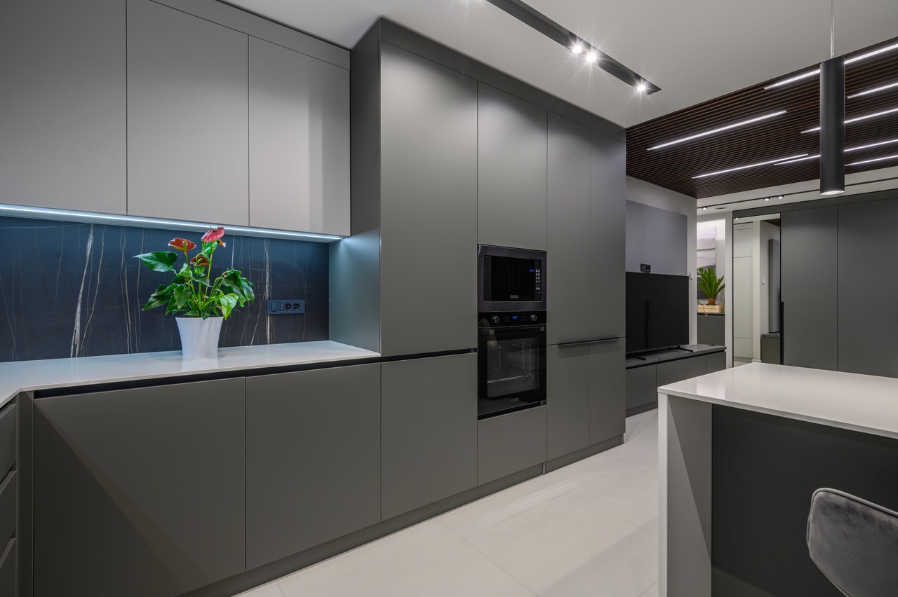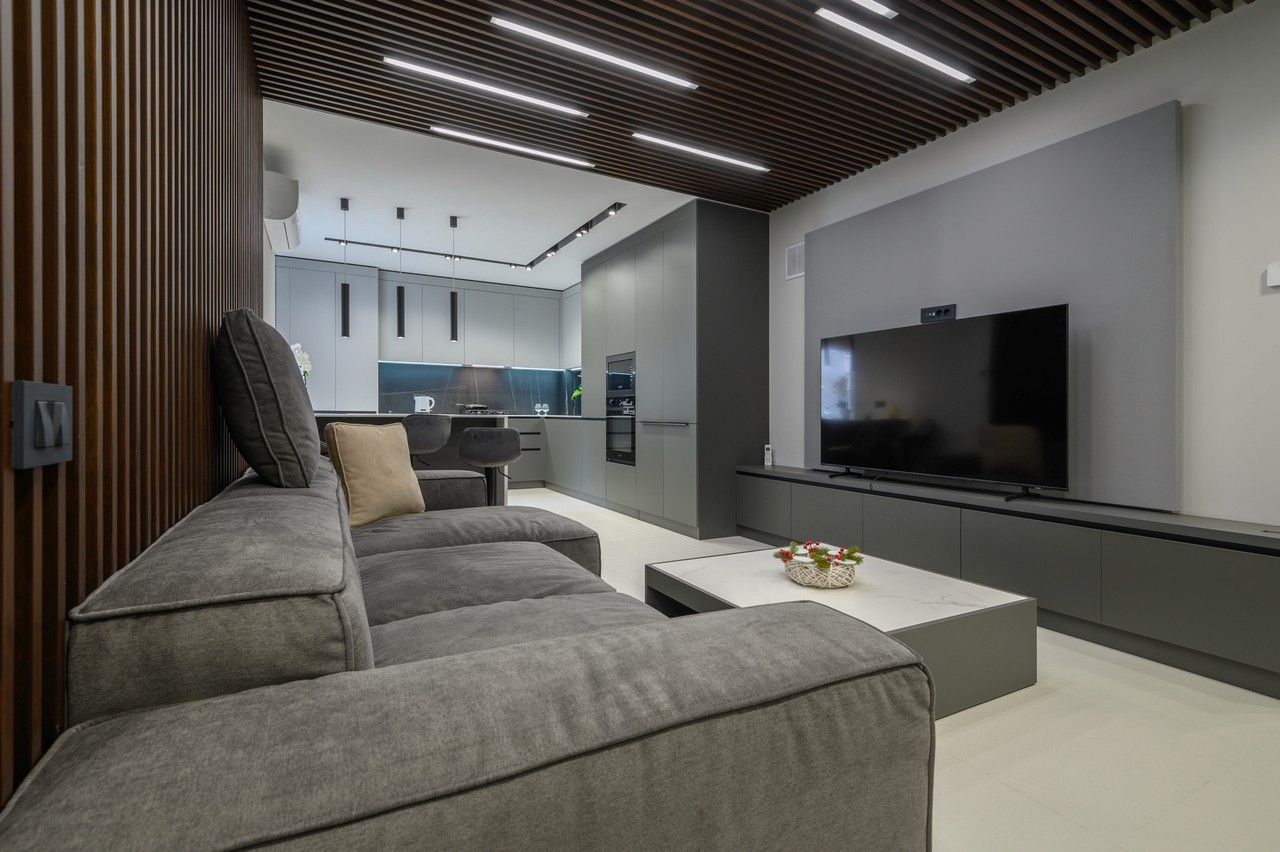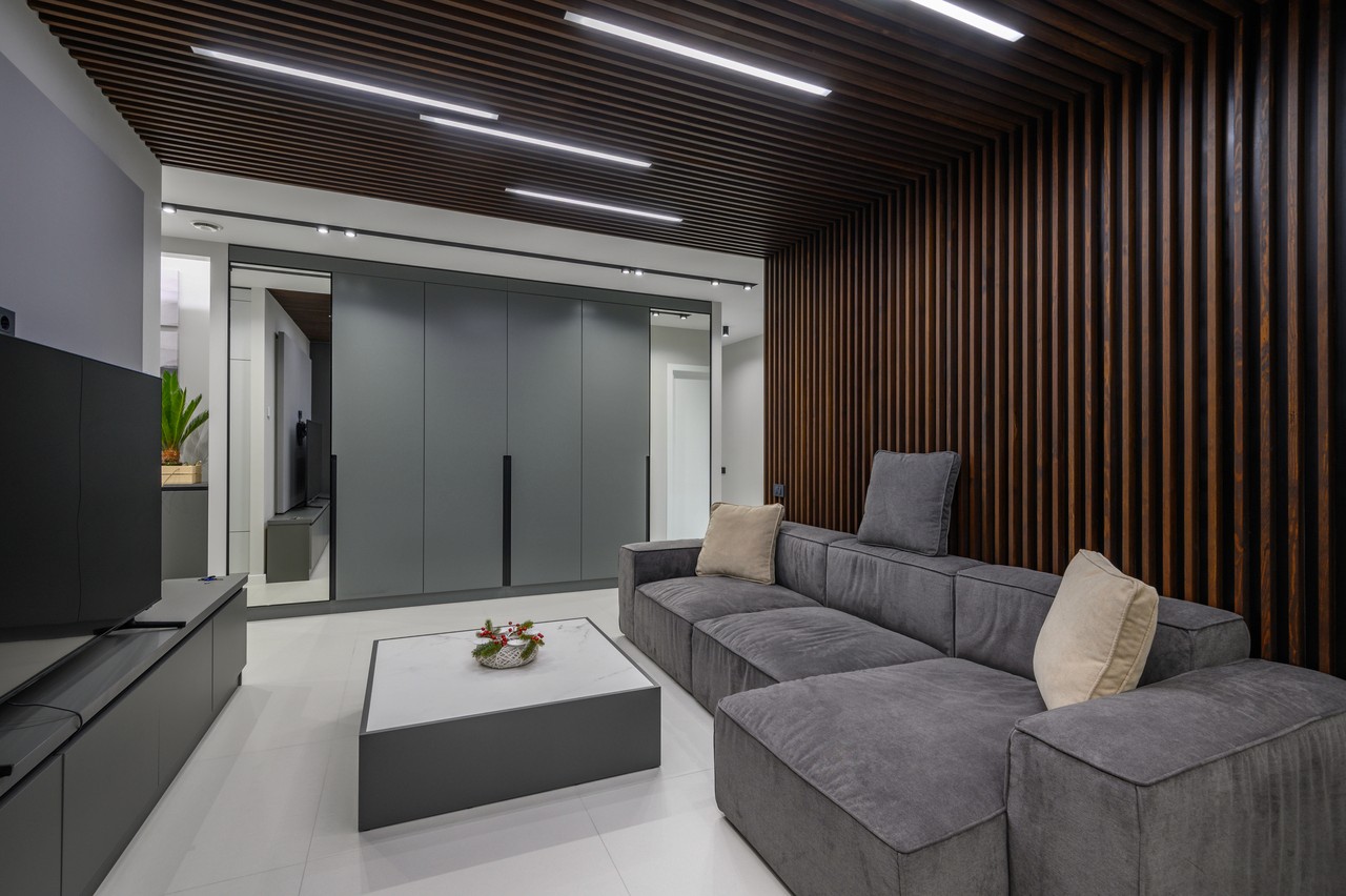 A sleek modern studio featuring dramatic dark wood slat ceiling details, handleless grey cabinetry, and crisp white surfaces for a refined minimalist aesthetic.