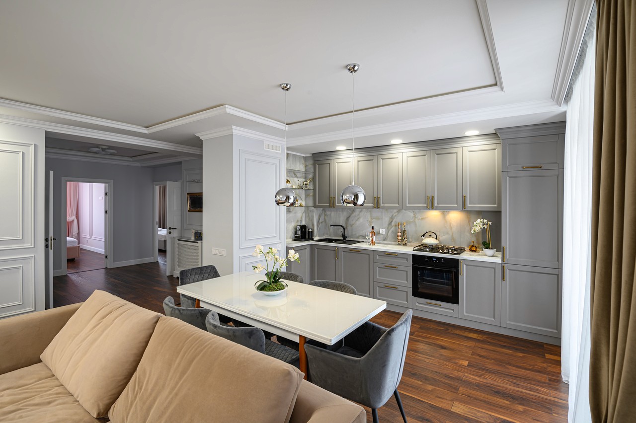 A refined kitchen featuring soft grey cabinetry, calacatta marble backsplash, and warm gold hardware, seamlessly connected to an elegant dining space.