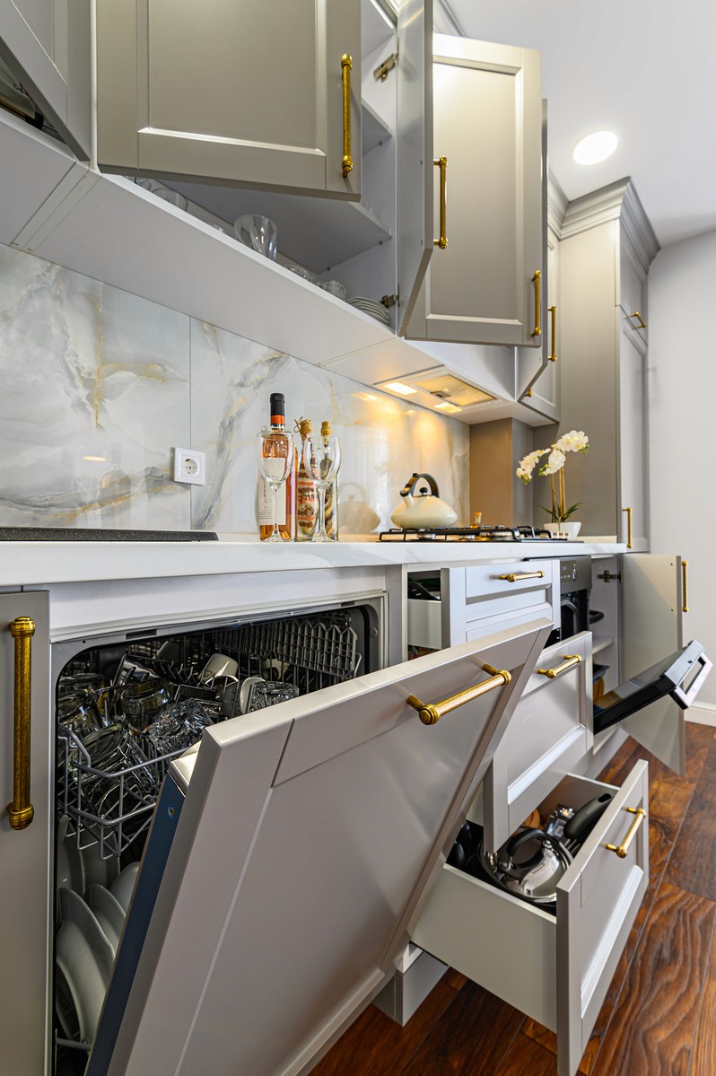 We selected soft grey shaker-style cabinetry with warm gold hardware for an elegant yet approachable look. The calacatta marble backsplash with subtle gold veining ties the palette together, while white quartz countertops keep the space bright and functional.